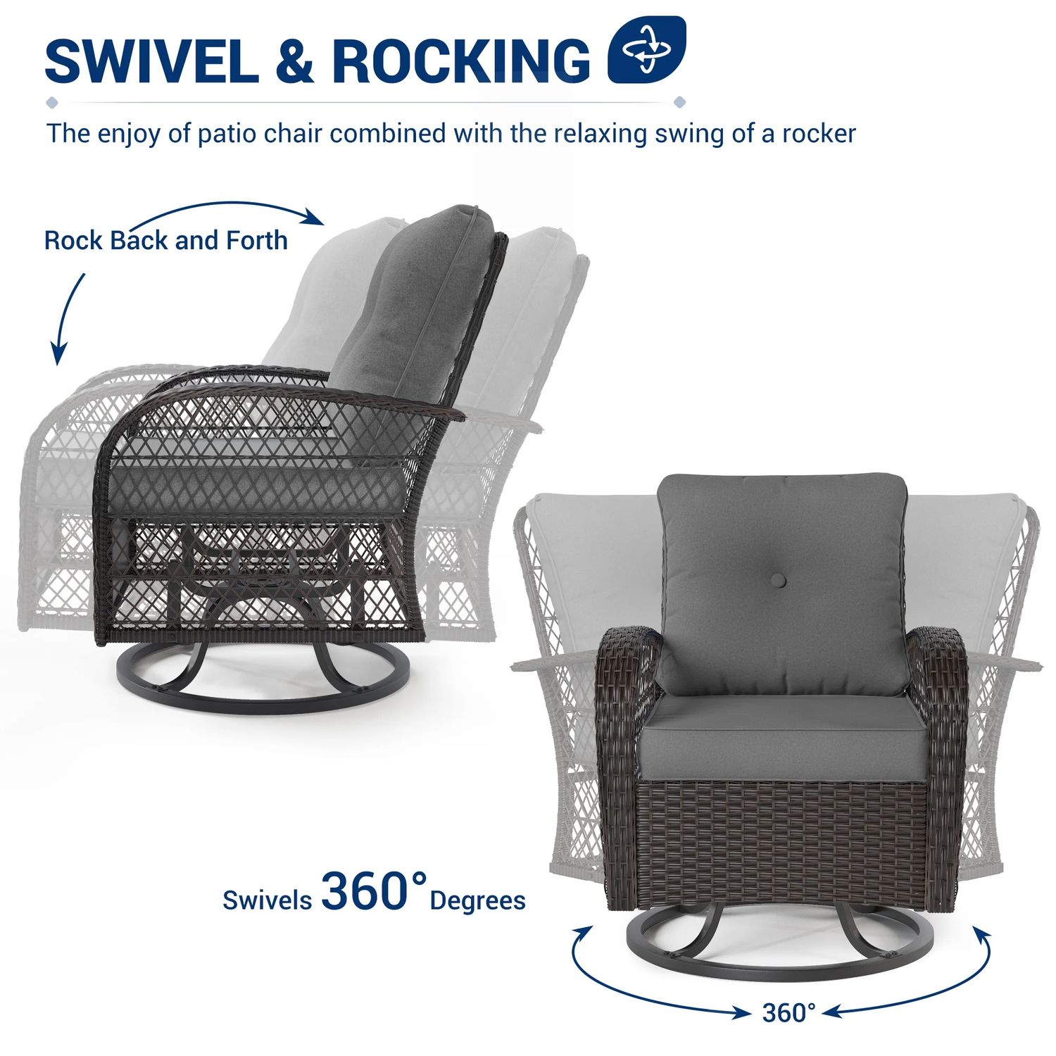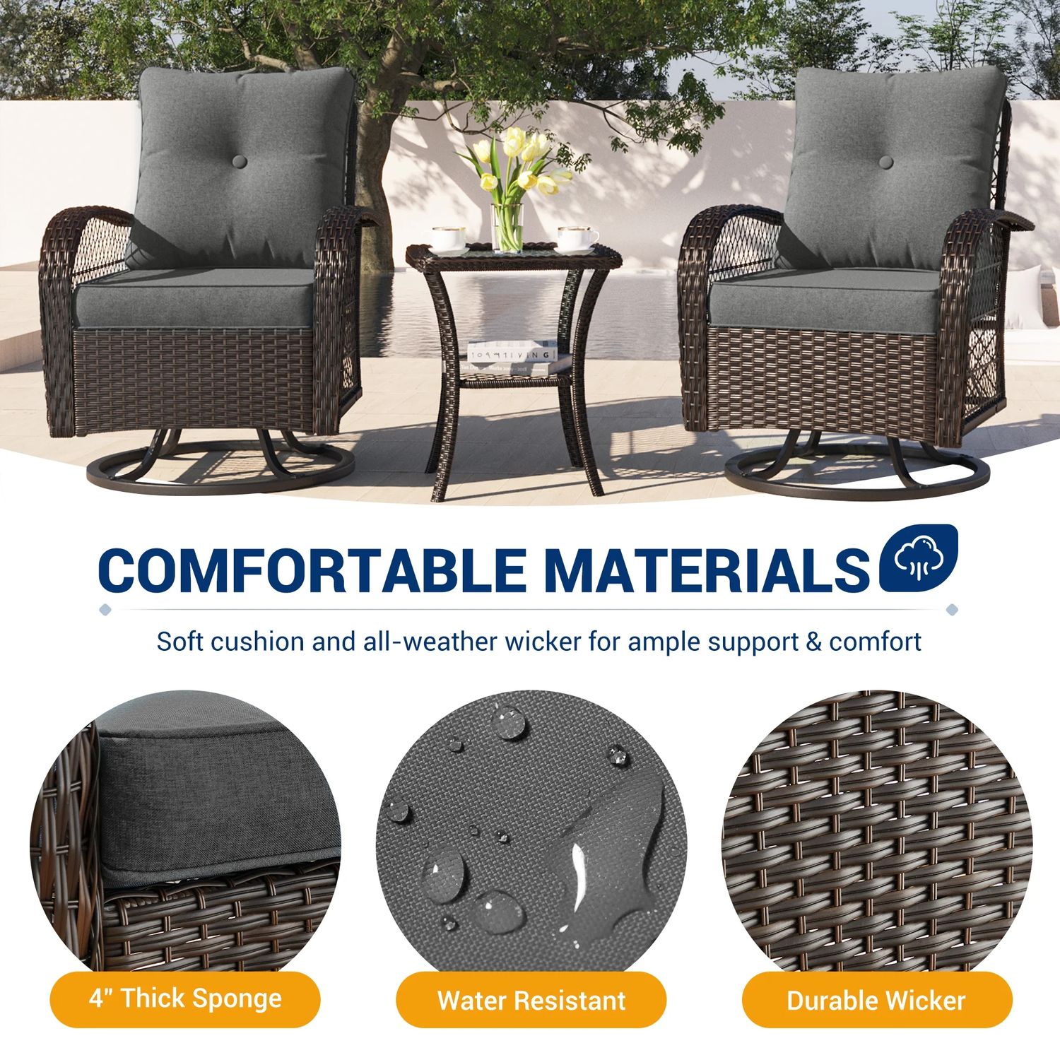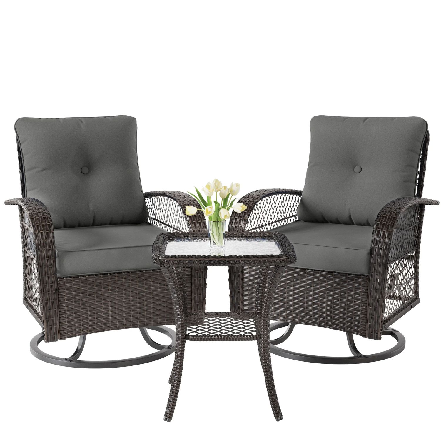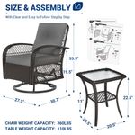 Poteban 3 Pieces Patio Furniture Set, Outdoor Swivel Gliders Rocker, Glass Top Side Table (Khaki)