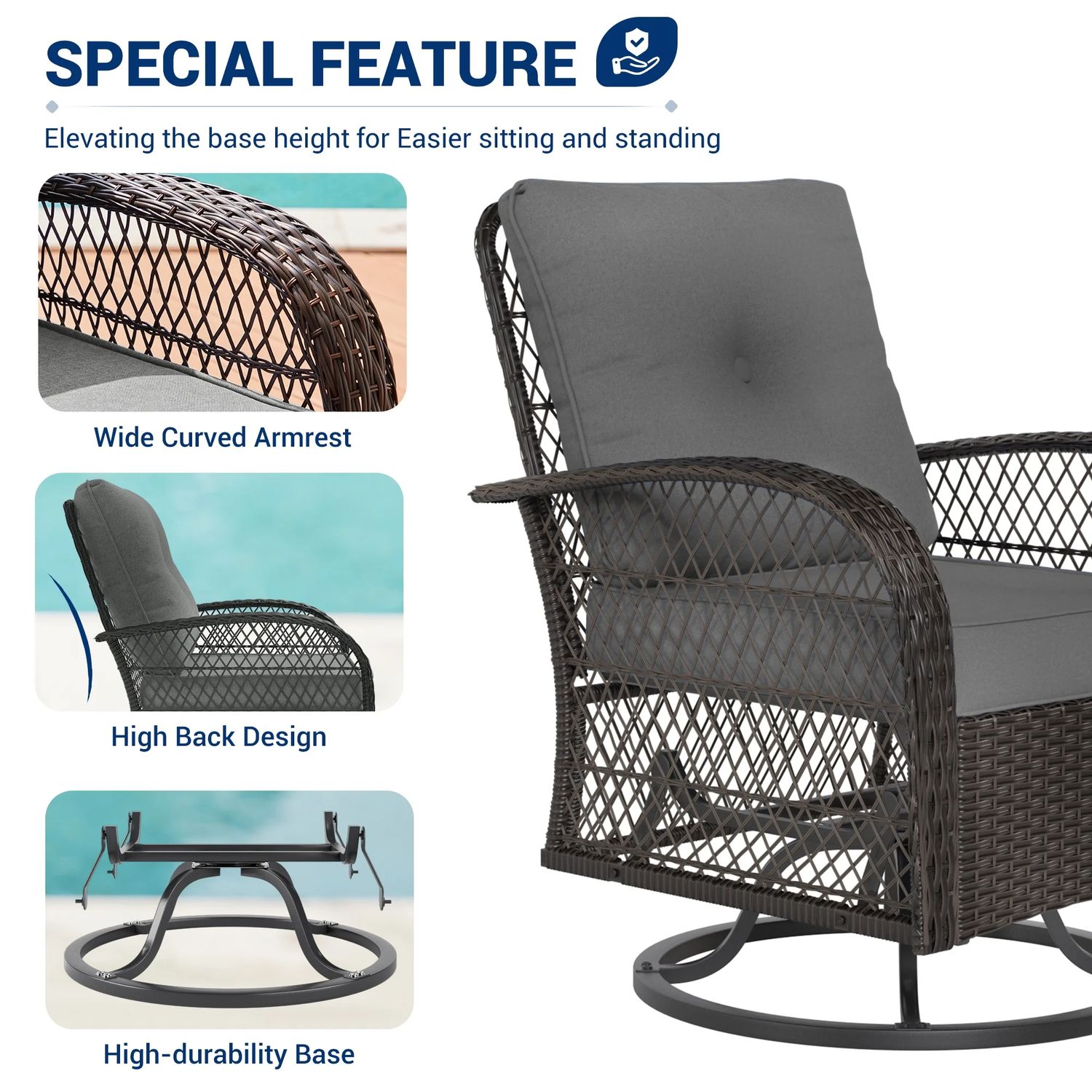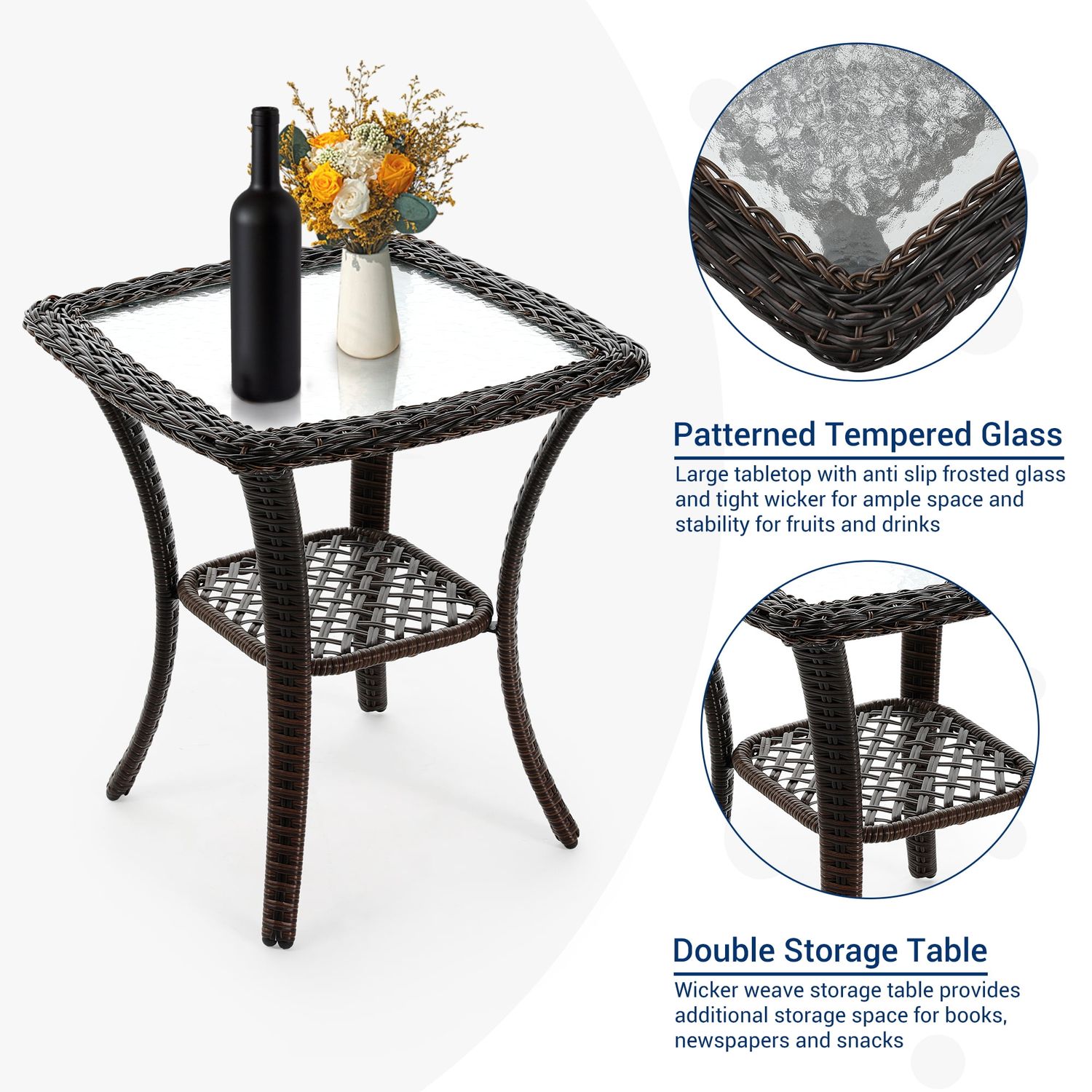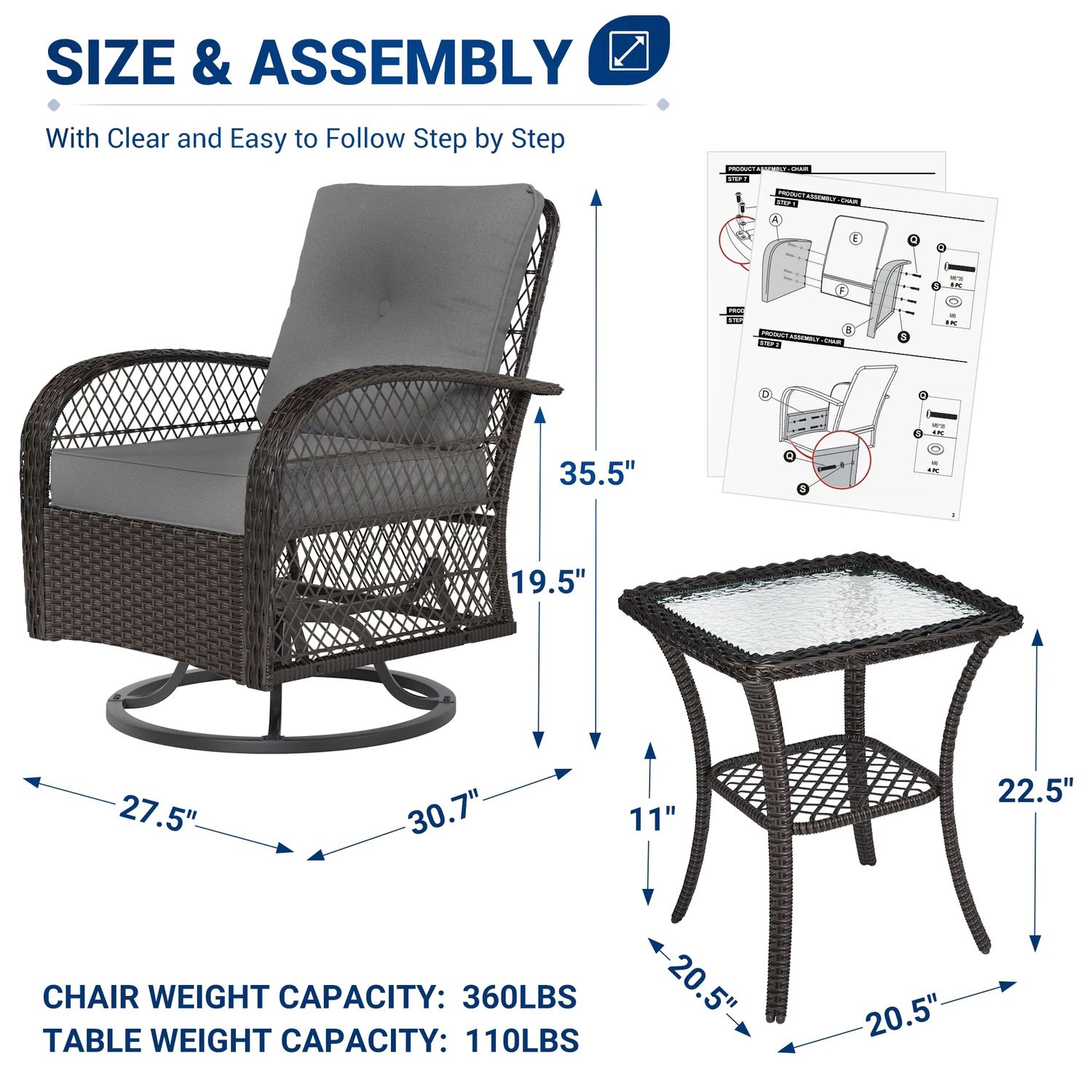 Poteban 3 Pieces Patio Furniture Set, Outdoor Swivel Gliders Rocker, Glass Top Side Table (Khaki)