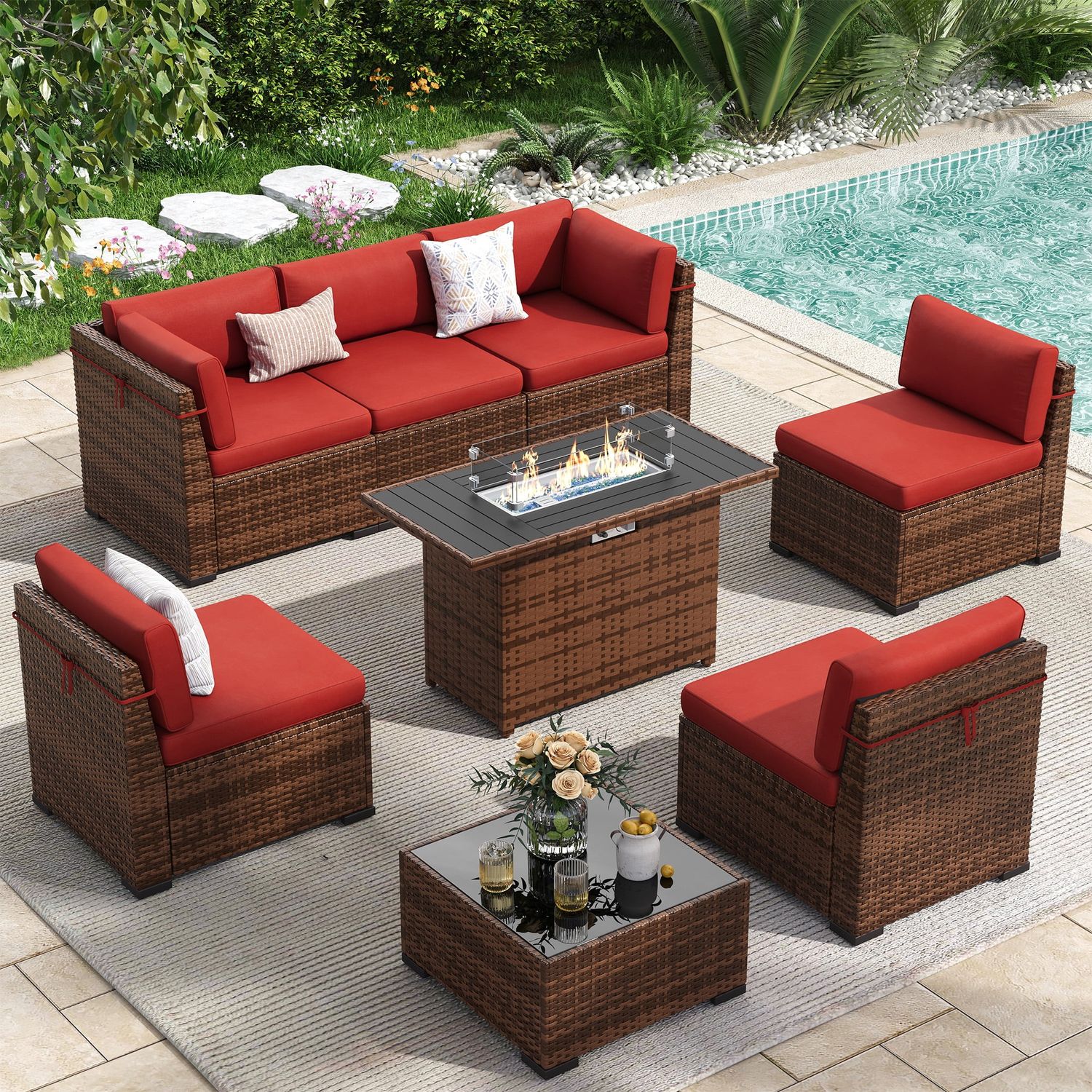Poteban 8 Pieces Outdoor Patio Furniture Set with 44" Fire Pit Table, Brown Wicker Rattan Sectional Sofa with Cushions and Glass Coffee Table for Back