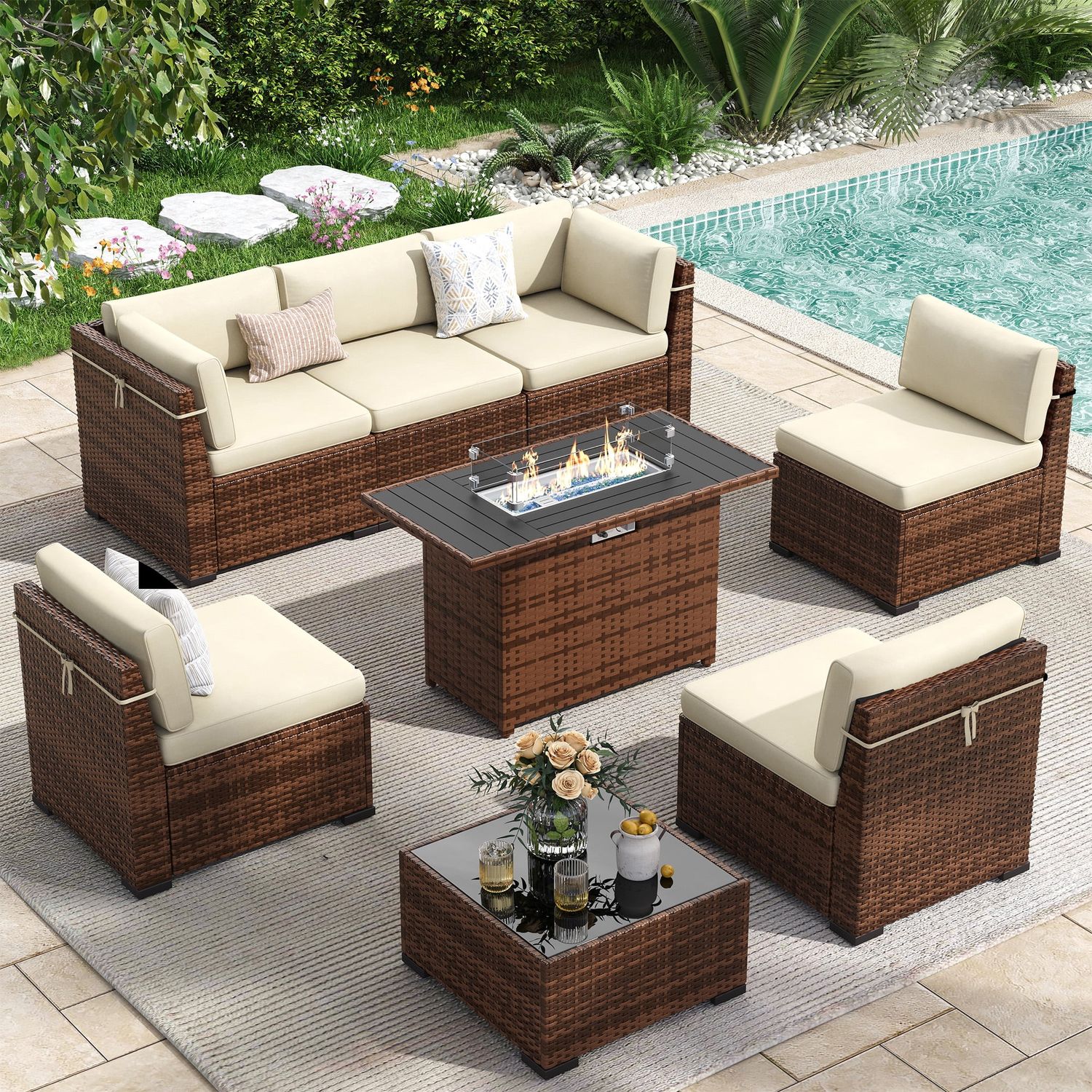 Poteban 8 Pieces Outdoor Patio Furniture Set with 44" Fire Pit Table, Brown Wicker Rattan Sectional Sofa with Cushions and Glass Coffee Table for Back
