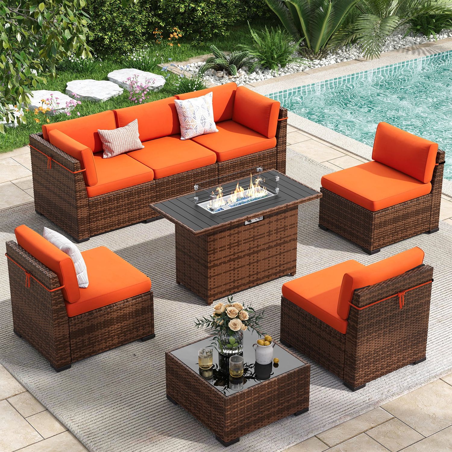 Poteban 8 Pieces Outdoor Patio Furniture Set with 44" Fire Pit Table, Brown Wicker Rattan Sectional Sofa with Cushions and Glass Coffee Table for Back