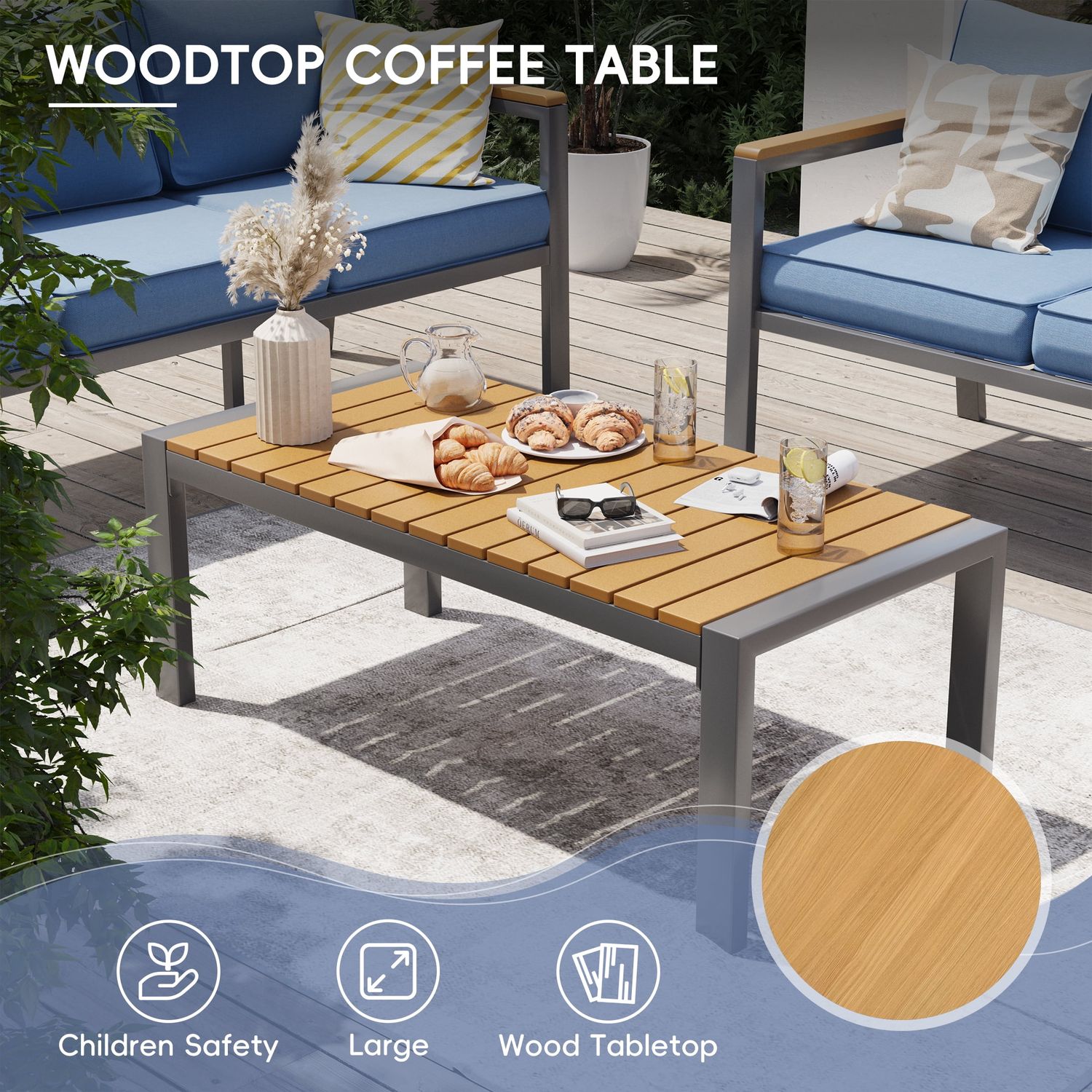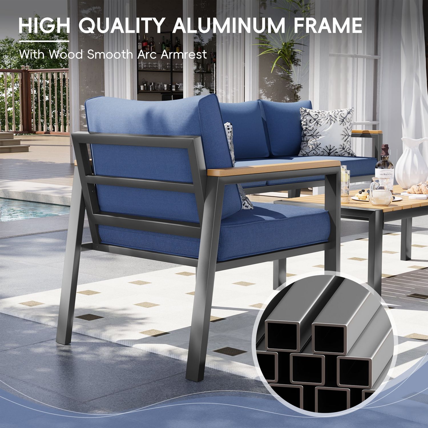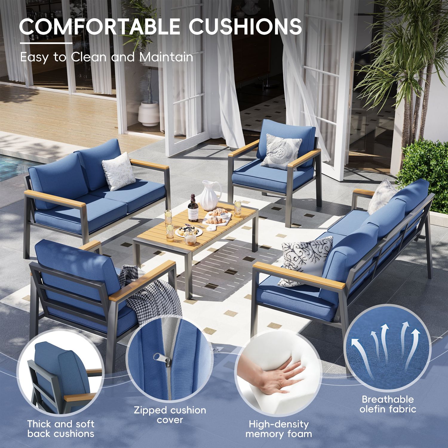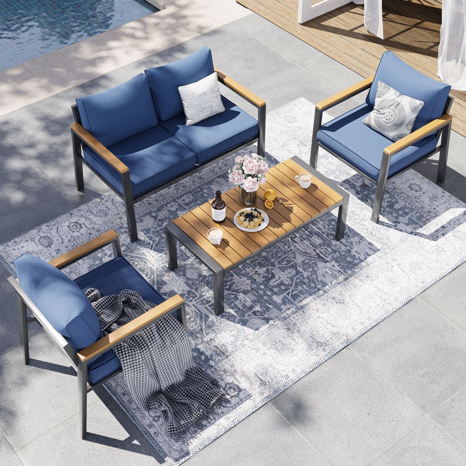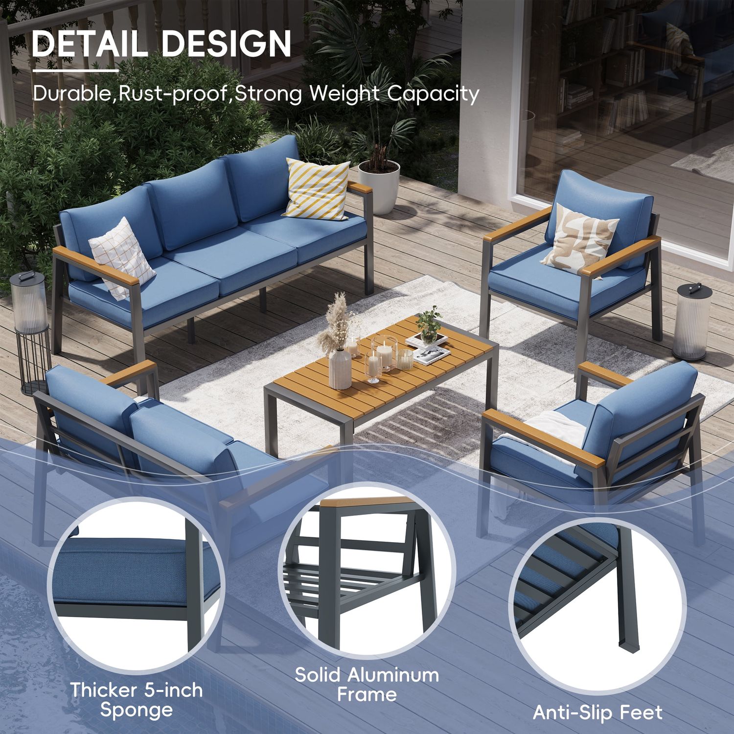 Poteban Aluminum Patio Furniture Set, Modern Metal Outdoor Patio Furniture, 5 Pcs Patio Conversation Sets with Wood Top Armrest & Table for Poolside