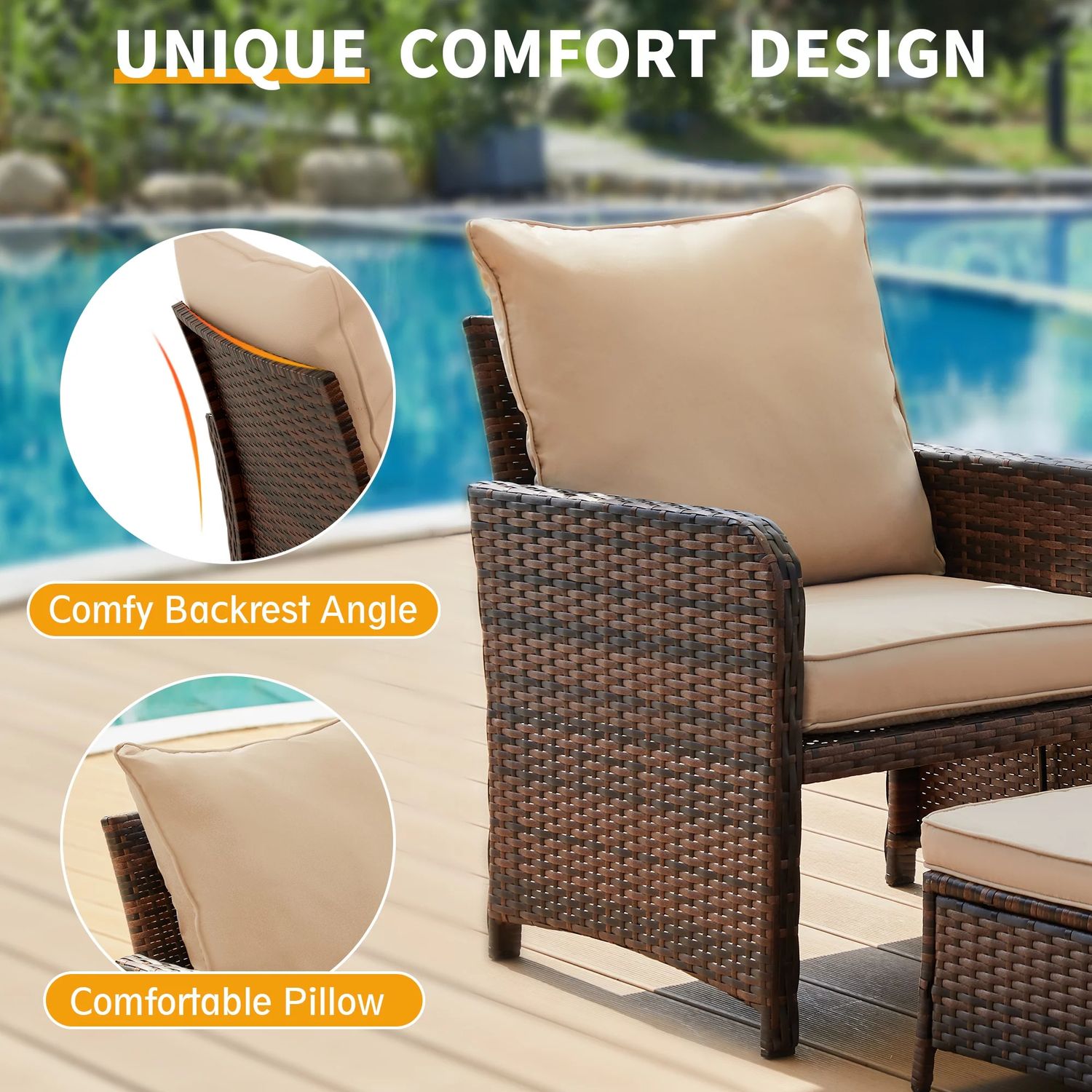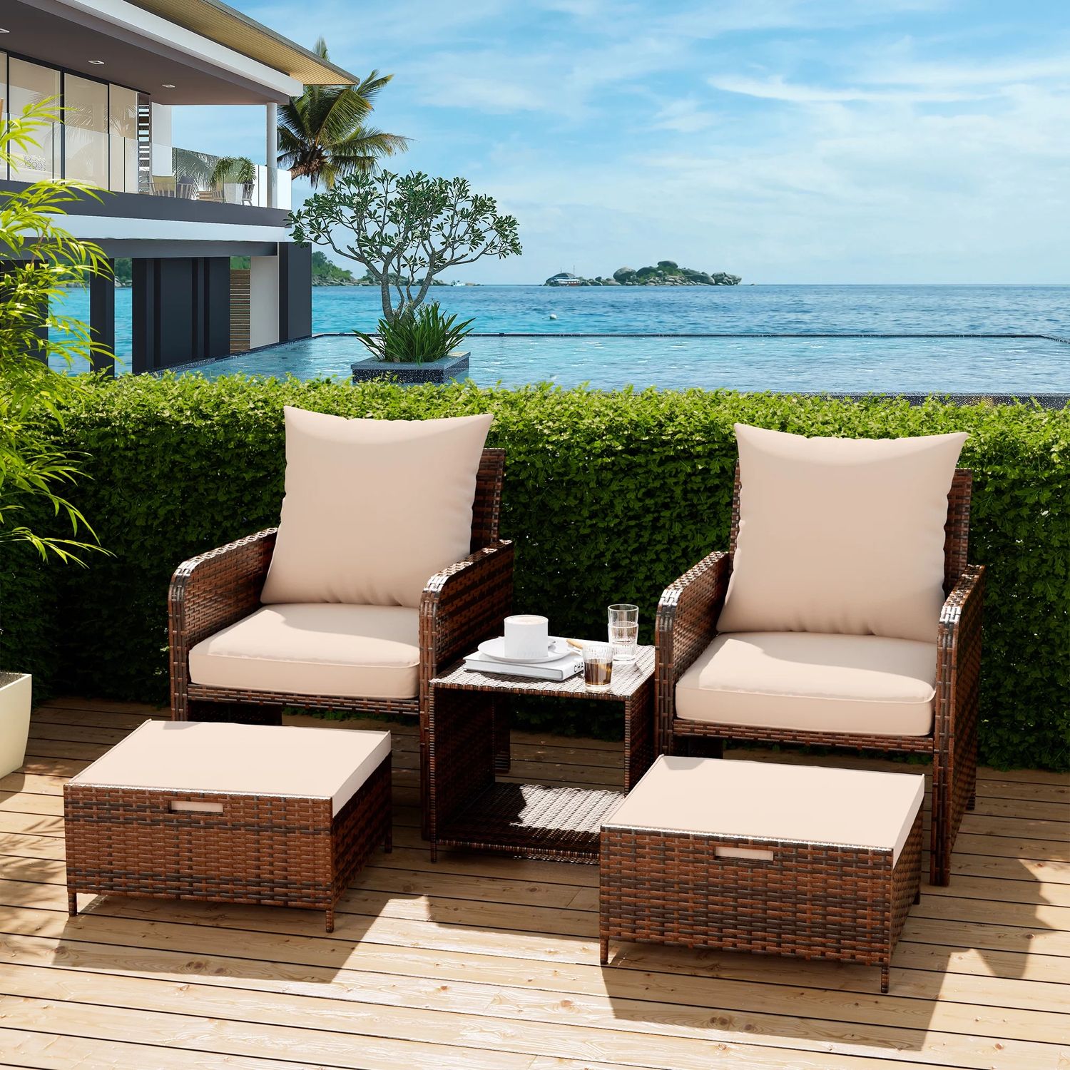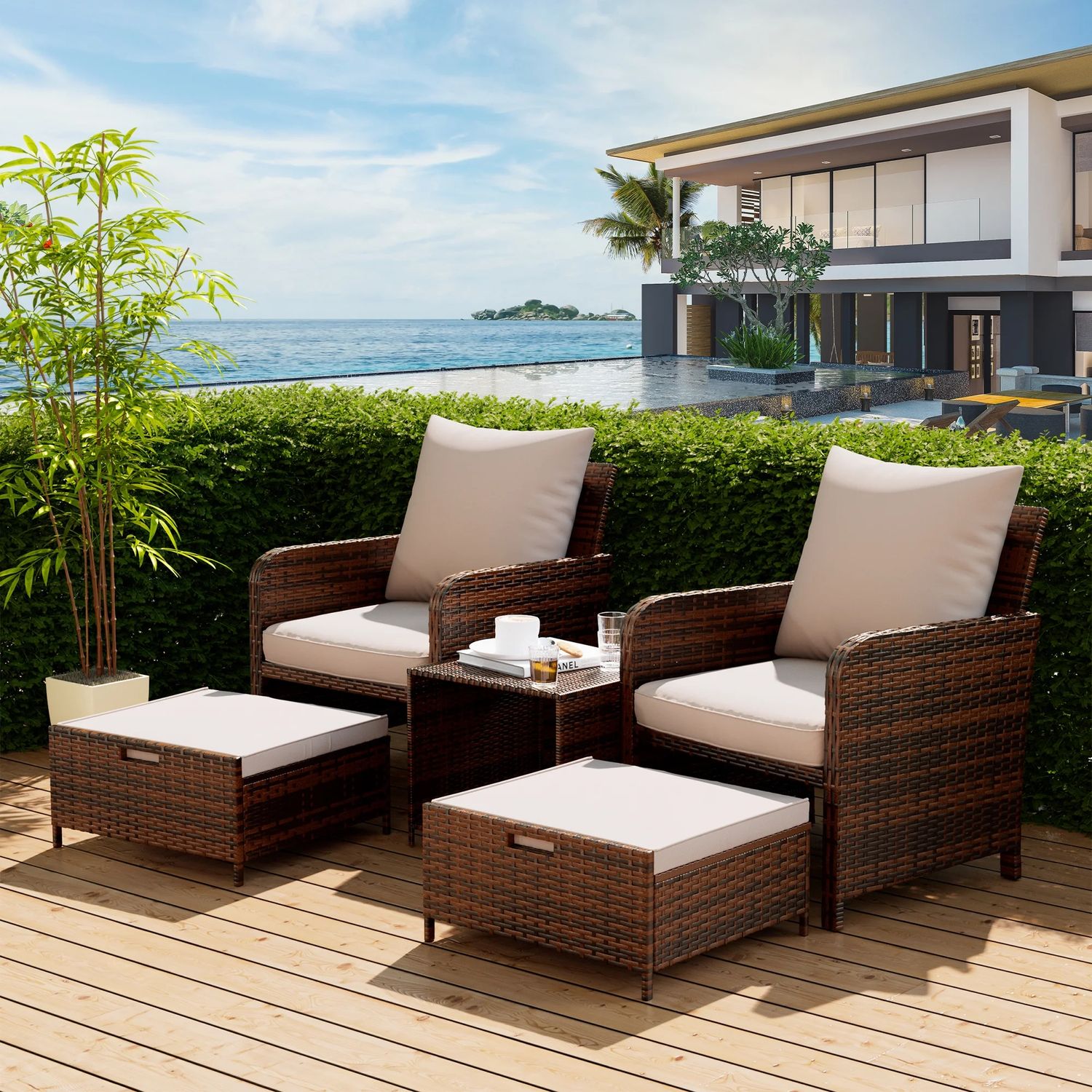 Poteban Balcony Furniture 5 Piece Patio Furniture Set, Outdoor Patio Chair with Ottoman for Front Porch Deck, Wicker Lounge Chair with Side Table