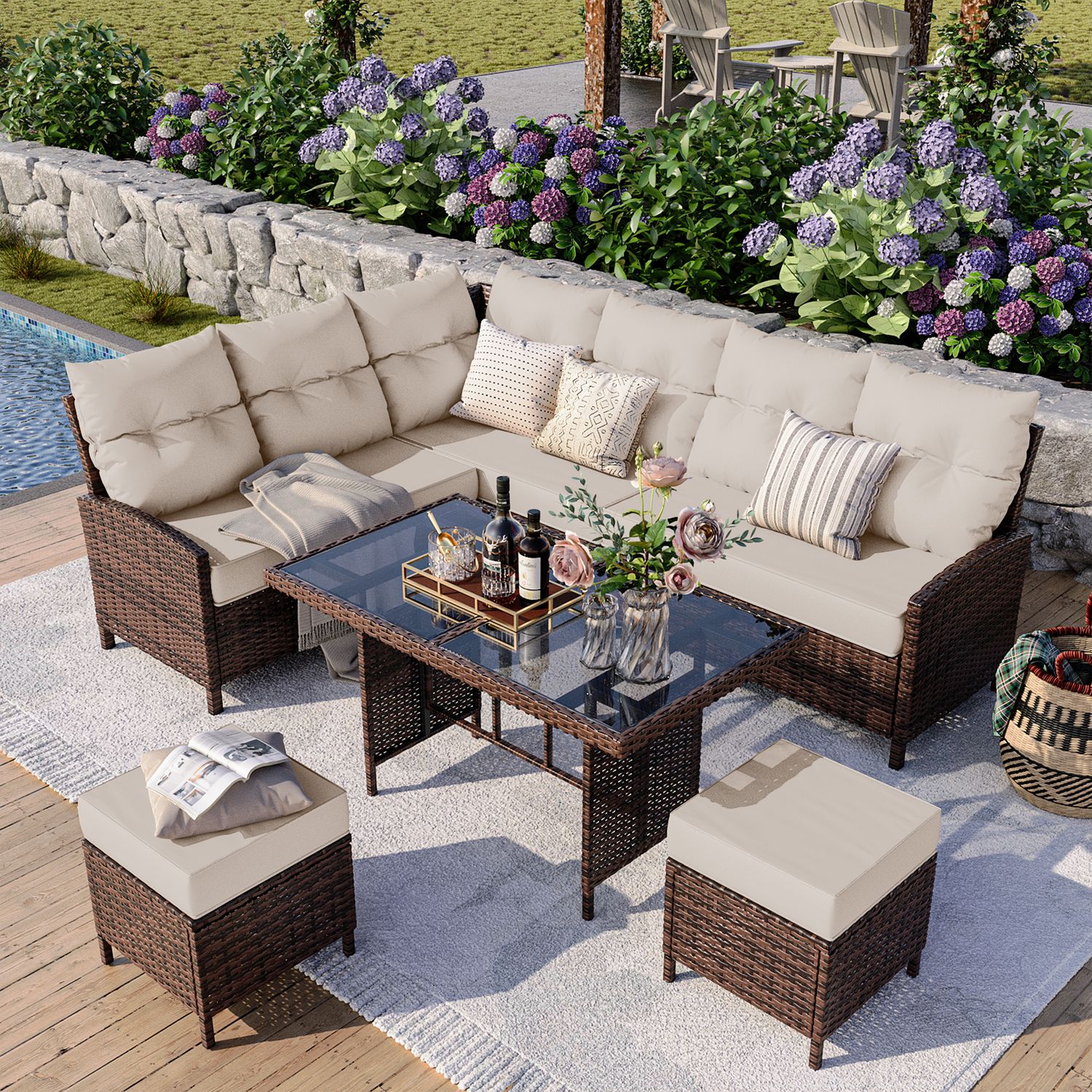 POTEBAN Outdoor Rattan 7-Piece Dining Set, Sectional Sofa Couch with Table & Chairs, All-Weather Conversation Set for Deck, Backyard, Khaki