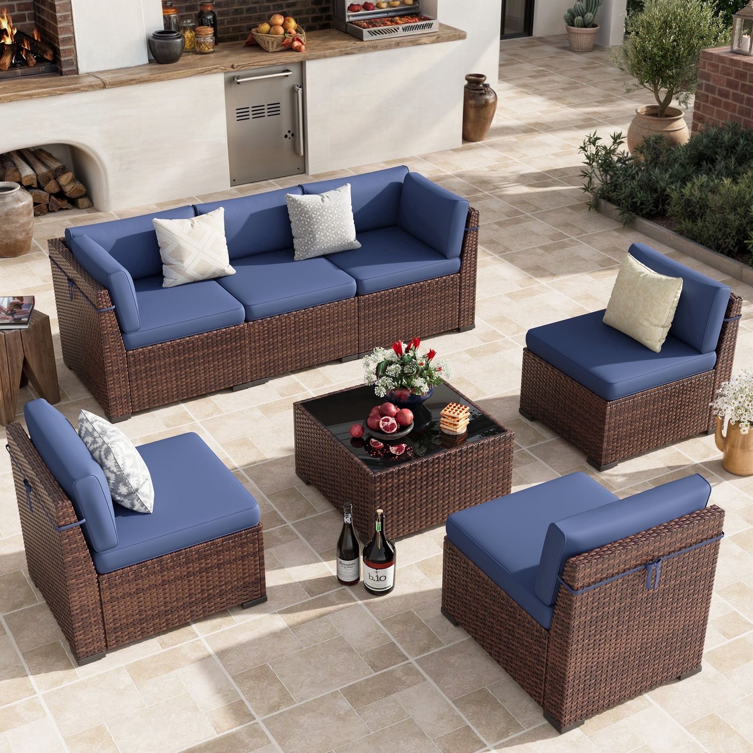 POTEBAN Patio Furniture Set, 7-Piece Outdoor Sectional All-Weather Wicker Patio Conversation Set for Backyard (Navy Blue Cushions with Brown Rattan)