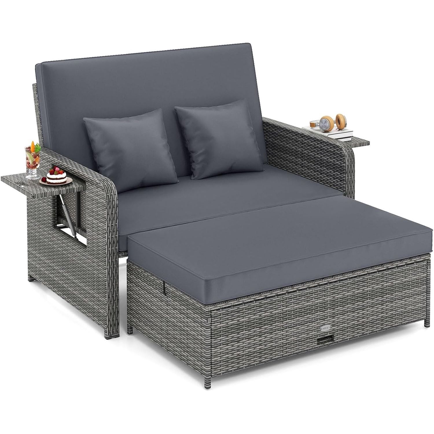 POTEBAN Wicker Outdoor Daybed-Outdoor Loveseat with Storage Ottoman, 4-Level Adjustable Backrest & Cushions for Balcony, Garden, Poolside (Gray)